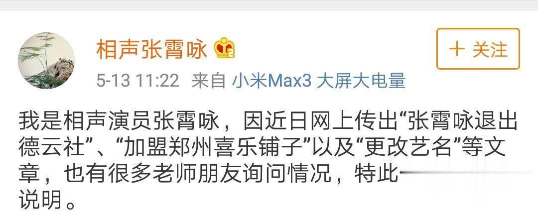 从张霄咏的这篇博文可以看出,德云社并非像某些人说的那样“内部不和”,他们很团结,很热爱相声,张霄咏也只是暂时不在德云社演出,病好后他就会回归,当事人都出来说话了,如果还有人说他是退社的话,那就真的是别有用心了!